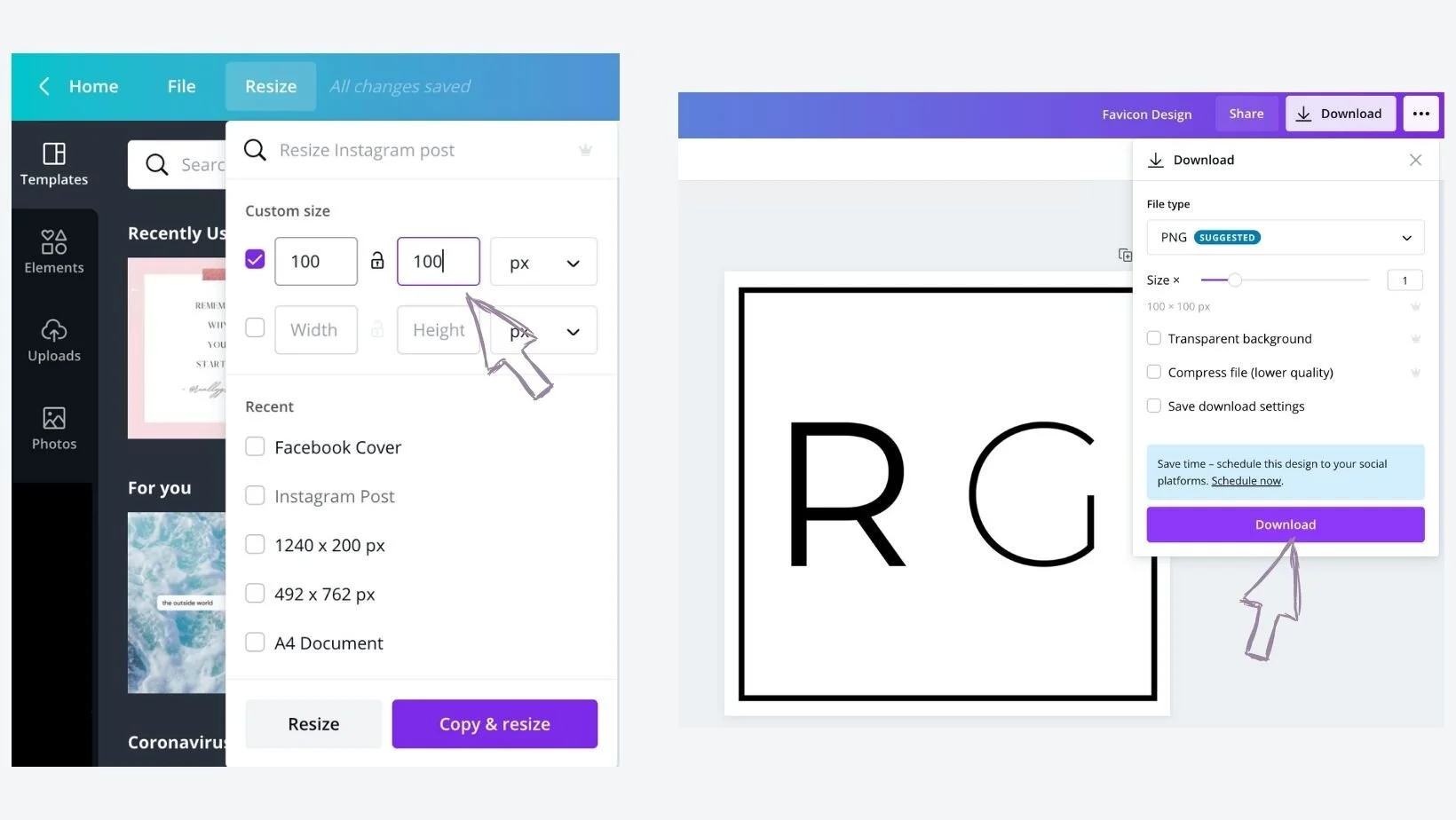 I would recommend using Canva* to create your favicon if you don’t have, or use programs such as Adobe Photoshop. Canva has a free version (which I would completely recommend signing up to if you haven’t already!). Once in Canva use a blank Instagram post template as your base (as this is already square), resize the template to the size of your choice (between 100 x 100px and 300 x 300px) by clicking resize on the top left menu bar. Input your dimensions here (making sure it’s set to px on the drop down box) and then click resize.