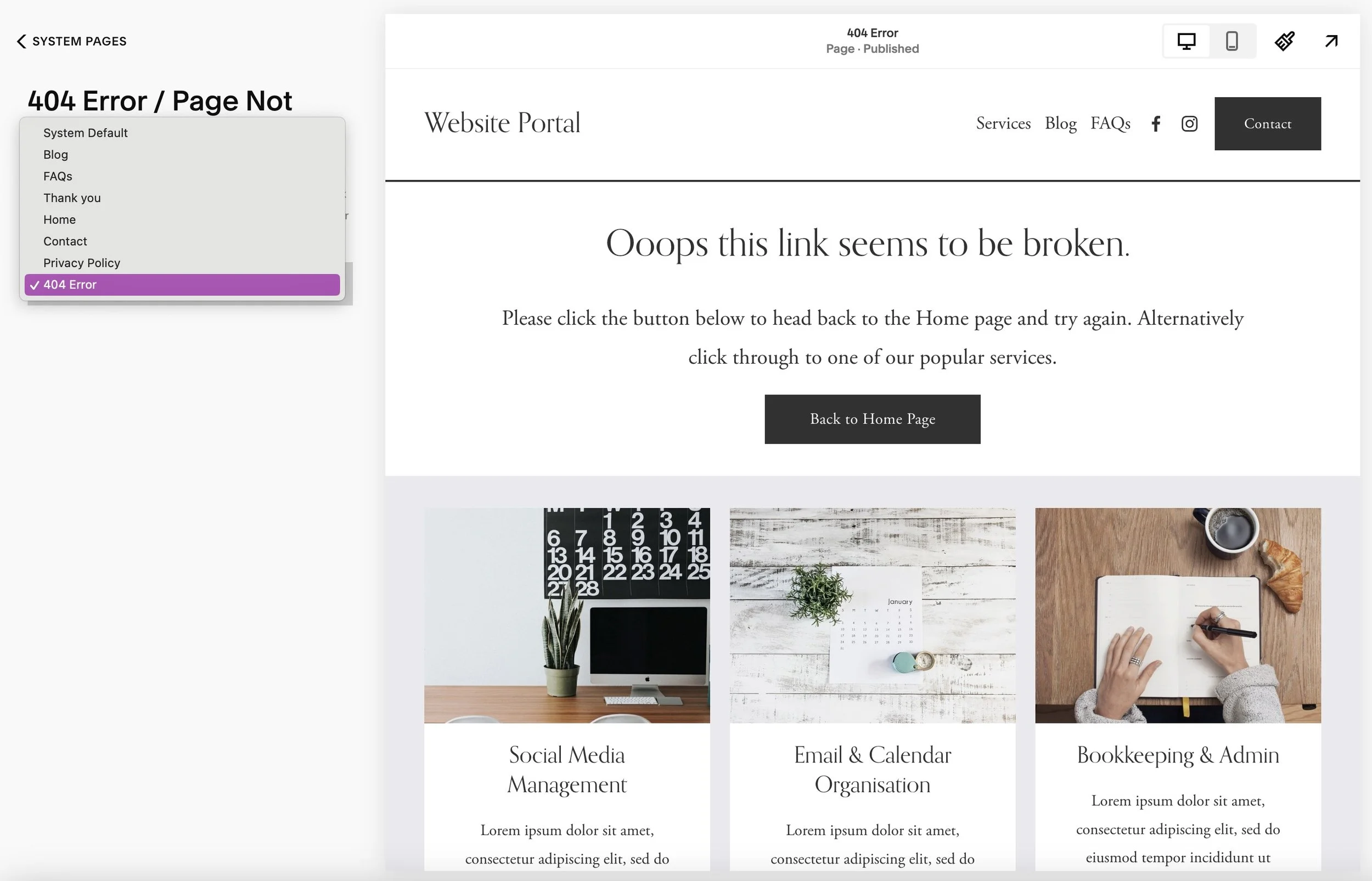 Create a new page under the Unlinked page menu. Either use saved section layouts or create new sections with the content you would like to include. Make sure the top page banner makes it clear that this is an error page and you are going to help redirect them, we don’t want to create confusion for the visitor. Always offer the option to go back to your Home page and try again, but in addition to this you can offer extra content.