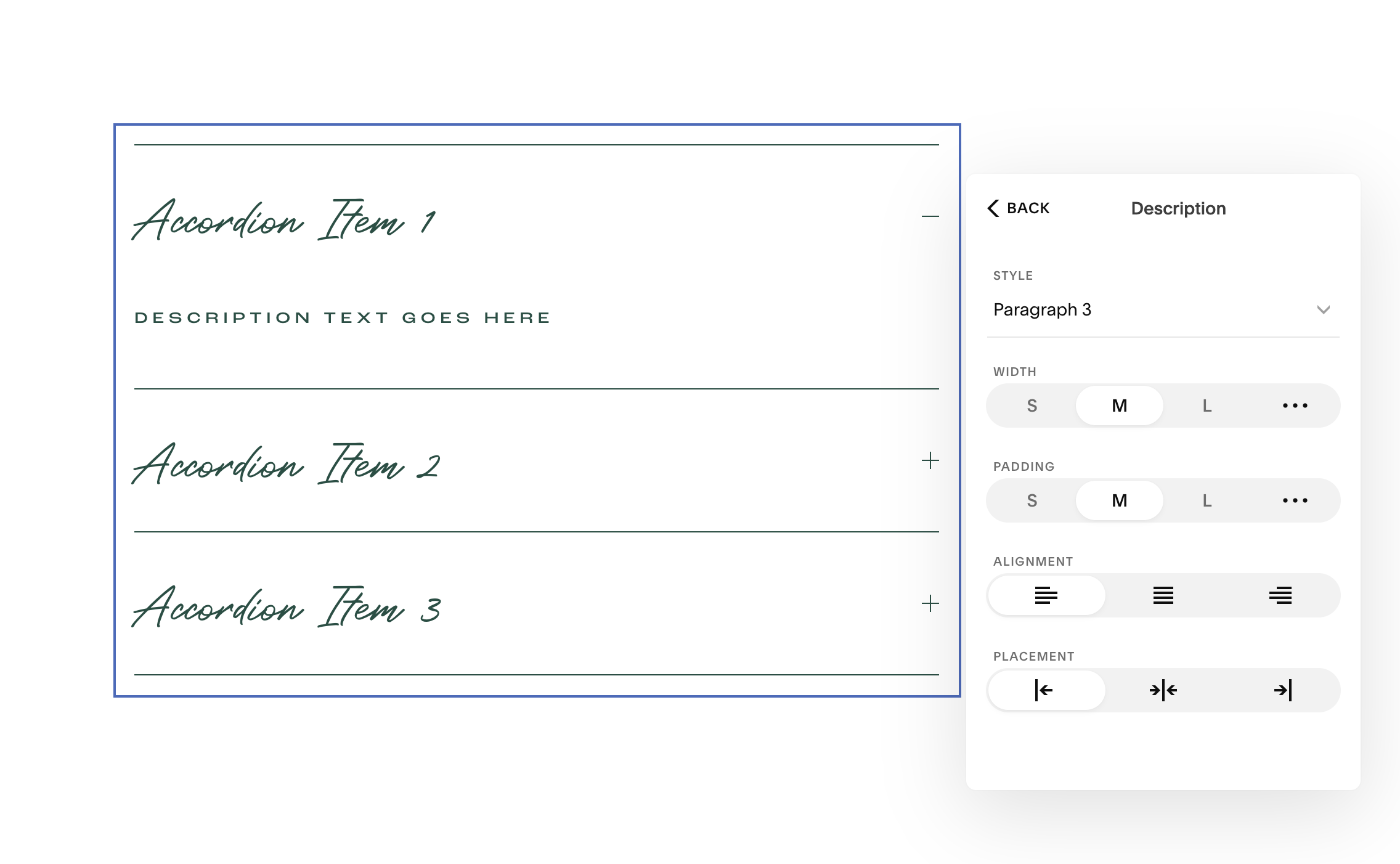 Once your text has been inputted, decide on the font style for the title and description by clicking on the ‘Design’ tab. The font styles available are the same as those used across your website (h1, h2, h3, p1, p2 etc). As seen in the image on the right below, you can also change the width, padding, alignment and placement of text.