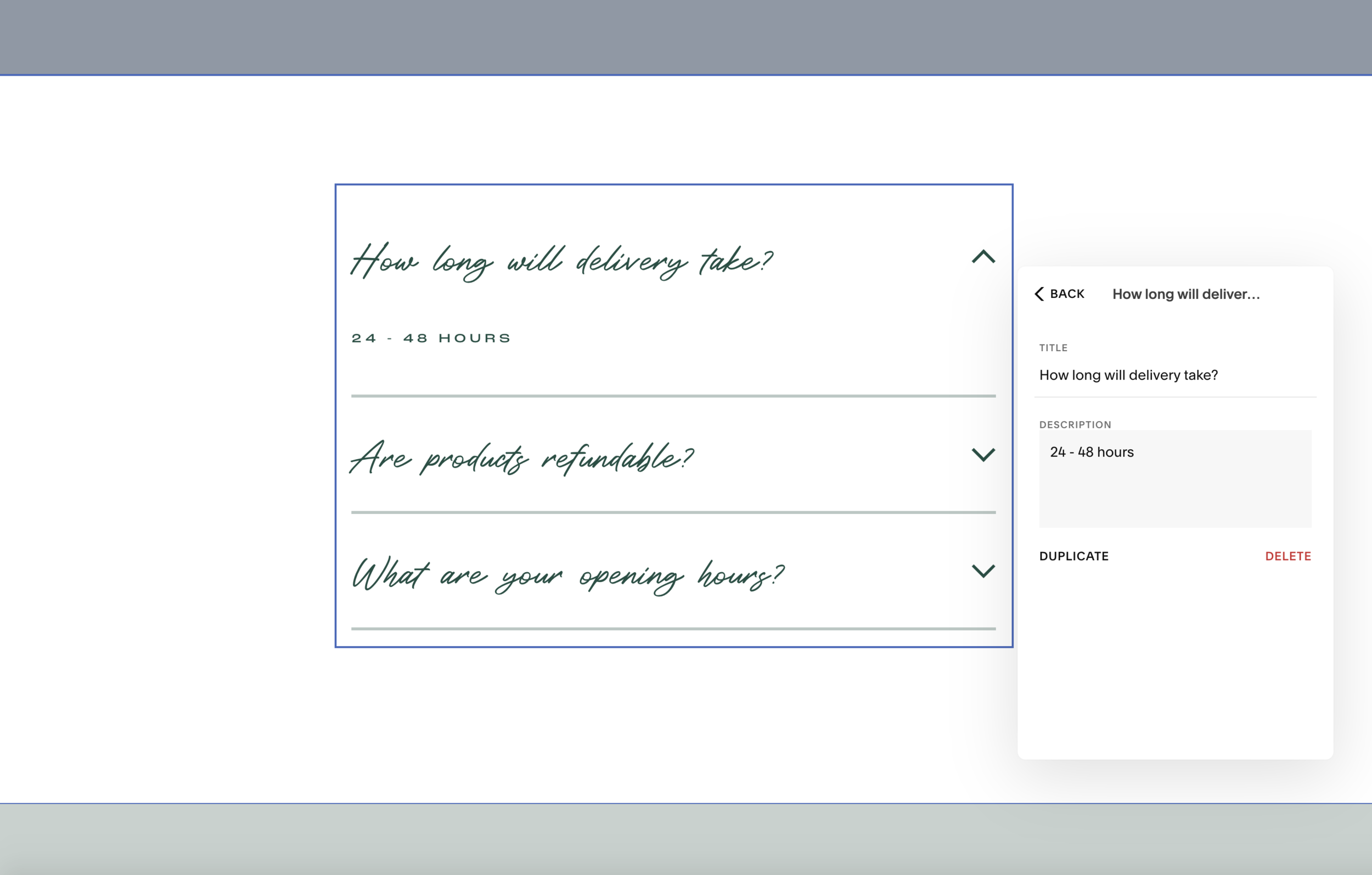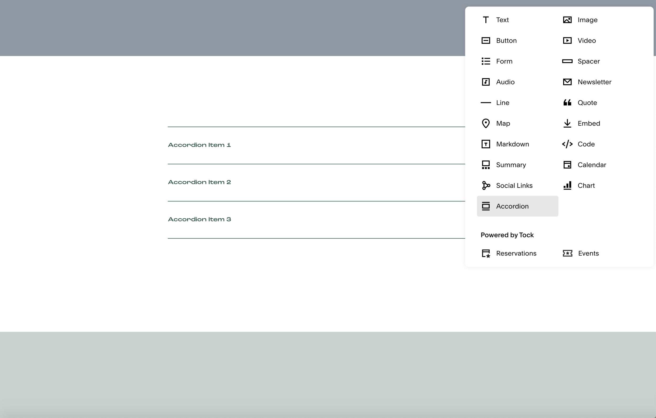 Add a new block to your section and choose “Accordion” from the menu panel. Place your accordion block in its own section if you would like to play around with the font and background colours without affecting other elements within that section. The divider line and drop down icon colours can be changed within the colour style panel in ‘Site Styles’.