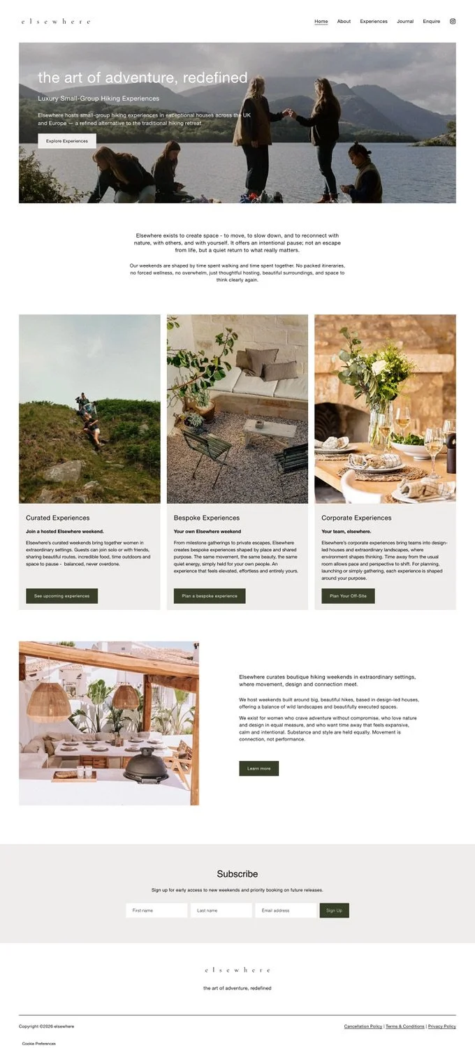 Clare was on the cusp of something exciting - launching Elsewhere, a luxury small-group hiking experience for women who want adventure without compromise. She had a clear, beautiful vision: editorial, minimal, image-led, and intentional. But when she sat down to build it herself, the DIY version just wouldn't do her brand justice. The aesthetic she was imagining - that quiet luxury, that sense of space - wasn't translating, and she knew it.
