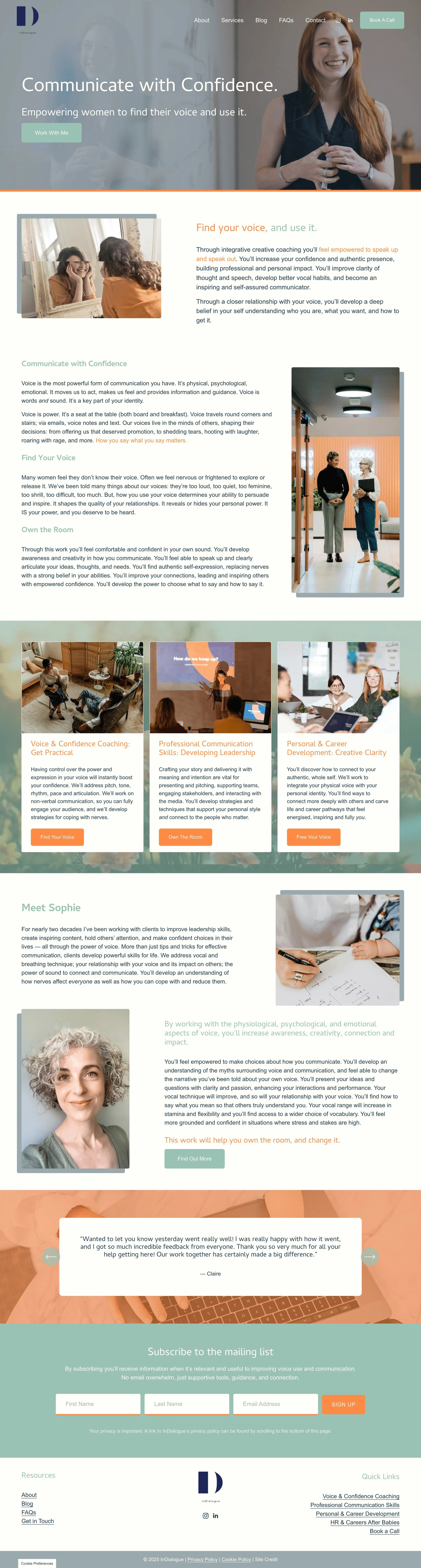 Over the course of a single day, I rebuilt and redesigned the InDialogue website on Squarespace, incorporating the updated colour palette, new content, and refreshed imagery. The result was a professional, user-friendly site that reflected Sophie’s work and brand perfectly.