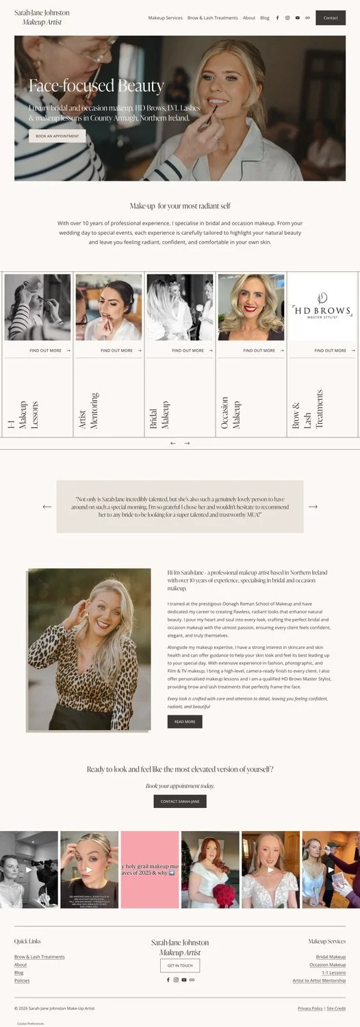 Sarah-Jane has been creating stunning makeup looks for brides and clients across Northern Ireland for over a decade. Her reputation? Built entirely on talent, word of mouth, and a loyal following on social media. But without a website, she had no central home for her business. No single place where a potential client could land, fall in love with her work, and know exactly how to book her. She knew it was time, but the thought of building a website from scratch felt like a mountain too big to climb alongside running a thriving business.