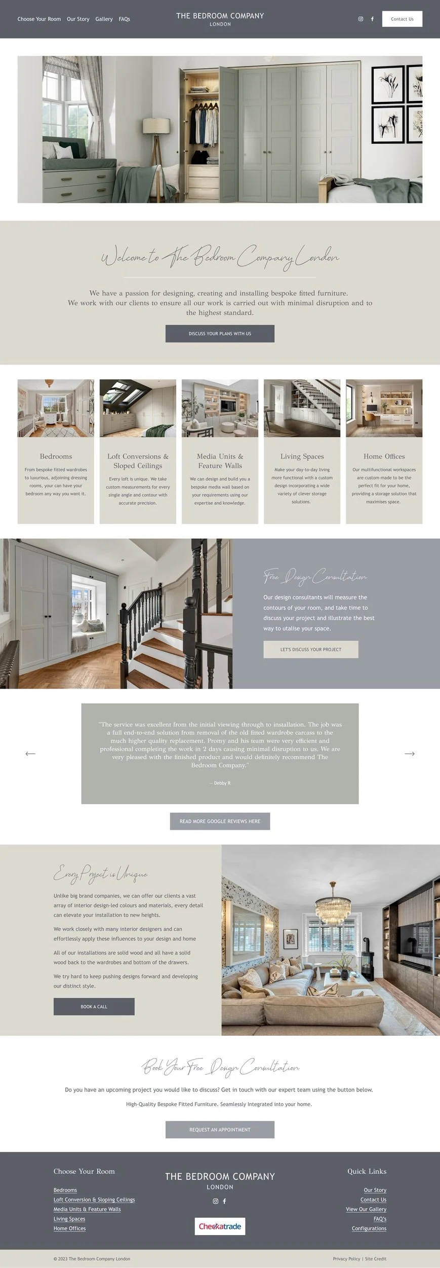 The Bedroom Company London's Eleni reached out to me, expressing her embarrassment in sending clients to their website. Despite using Instagram as their main portfolio, they were not promoting their website at all. Unfortunately, due to their past experience with a Squarespace web designer, they found themselves in a difficult position where they had no access to the back end of their website. This left them unable to make updates or even consider a full redesign, leaving them feeling stuck.